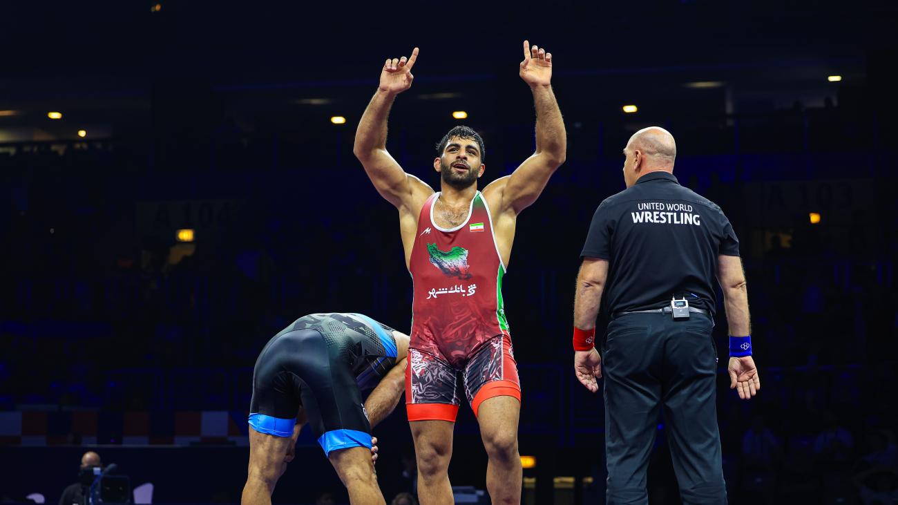 10:15: World U23 champion Fardin HEDAYATI (IRI) squares up against the Mohamed ABDELLATIF (EGY) in Round 1 at Greco 130kg. He begins with a stepout before securing the first par terre advantage. He scores one more point to win 3-0.